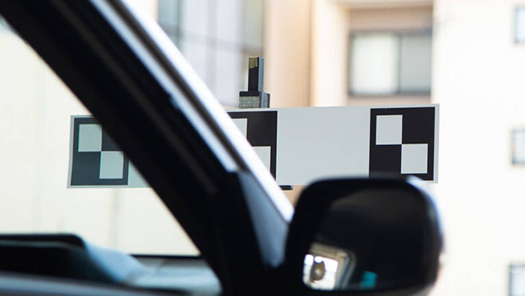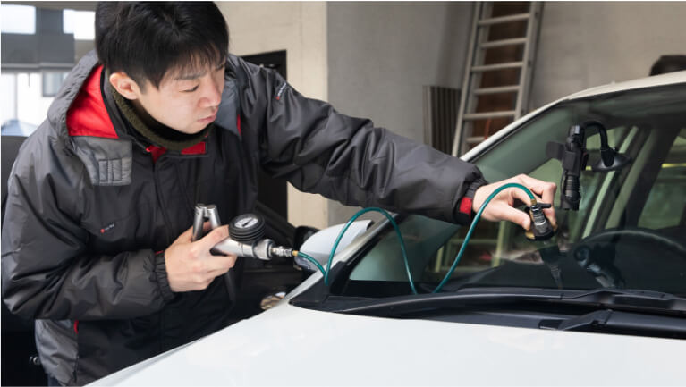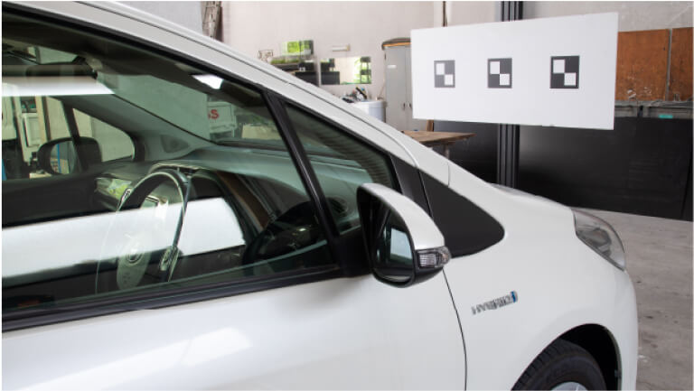 先進安全技術を搭載した車両(ASV)のガラス交換に対応するため、衝突被害軽減ブレーキなどの調整を行う専用エーミングスペースを完備しています。