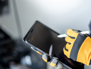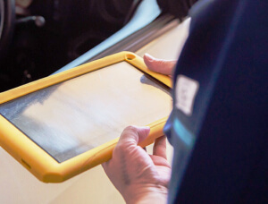 専用ツールで車両と接続し、カメラの調整作業を行います。