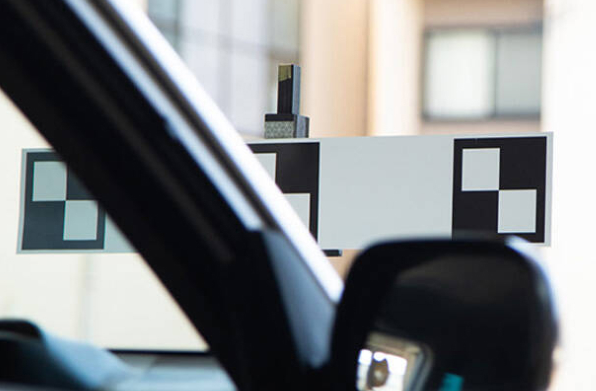 ターゲットと呼ばれるボードを車両に対して適正な距離や高さを計測し、中心に設置します。
